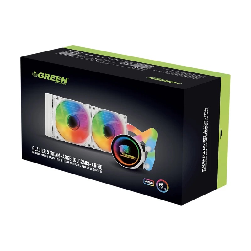 سری GLACIER STREAM-ARGB چشم نوازترین مدل های نسل دوم خنک کننده های آبی (واترکولینگ) گرین به گونه ای طراحی شده اند تا علیرغم نویز صوتی کمتر فن ها و پمپ، کارایی و دوام به مراتب بیشتری نسبت به نسل قبل داشته باشند. پمپ به مراتب قدرتمندتر و بی صداتر با کارایی 2 برابر بهتر از نسل قبل در کنار یاتاقان Copper Bearing، فن های فوق العاده بادوام از نوع Rifle Bearing با عمر متوسط بیش از 160,000 ساعت، لوله های 3 لایه با نورپردازی خیره کننده ARGB و آب بندی در کلاس صنعتی، واتربلاک مسی با طراحی پیشرفته 0.14mm Micro Channel و نورپردازی ARGB فن و بلاک با جلوه آینه بی نهایت (Infinite Mirror)، قابلیت همگام سازی با مادربرد (MB Sync) در کنار پشتیبانی از تمامی سوکت های مدرن پردازنده، تنها بخشی از ویژگی های ممتاز نسل جدید خنک کننده آبی گرین محسوب می شوند.