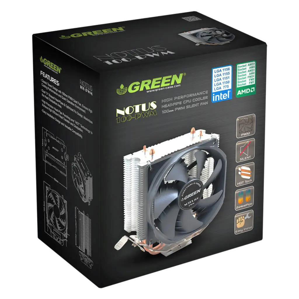 فن پردازنده (CPU) «NOTUS 95 PWM» محصولی از شرکت «گرین» است که در گروه فنهای بادی قرار میگیرد. این فن CPU شرکت گرین دارای 2 لوله مسی با ضخامت 6 میلیمتر است که بهطور مستقیم با پردازنده در تماس است و میتواند حرارت را از پردازنده به محیط بیرون منتقل کند. فن NOTUS 95 PWM از فناوری PWM بهره میبرد که به یاری آن میتوان سرعت 700 تا 2000 RPM را در آن تجربه کرد. حداکثر نویز در این پردازنده برابر با 32 دسیبل است که میتوان آن را در گروه فنهای کم صدا دستهبندی کرد. شرکت گرین یک فن 92 میلیمتری از نوع Fluid Shield Bearing را برای این محصول در نظر گرفته است. کانکتور فن ارائه شده برای این محصول از نوع 4-Pin بوده ولتاژ کاری در آن برابر با 12 ولت است. فن پردازندهی گرین مدل NOTUS 95 PWM با سوکتهای LGA1156, LGA1155, LGA1151, LGA1150, LGA775 شرکت اینتل و AM4 , AM3+, AM2+ , FM2+ , FM1 سازگار است.